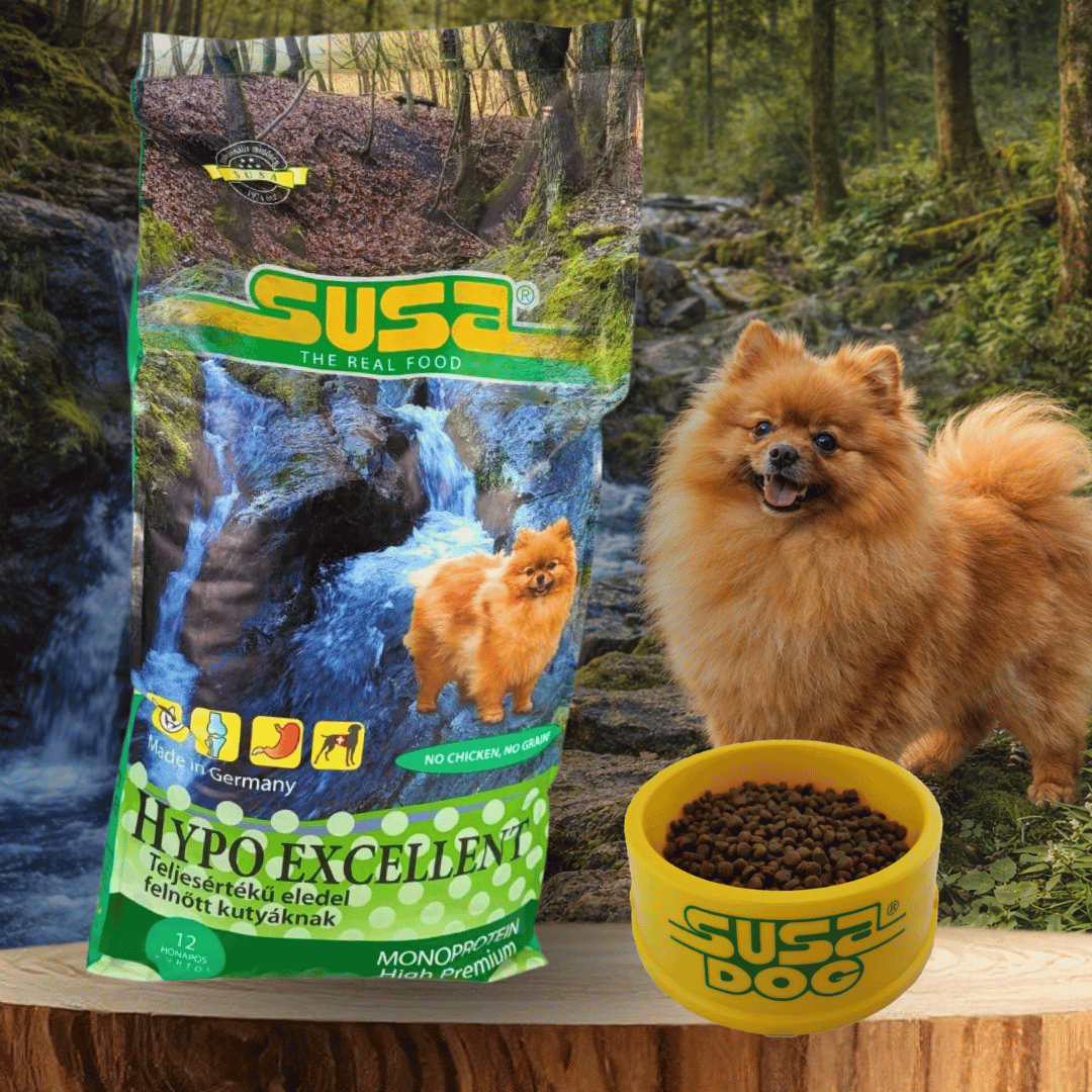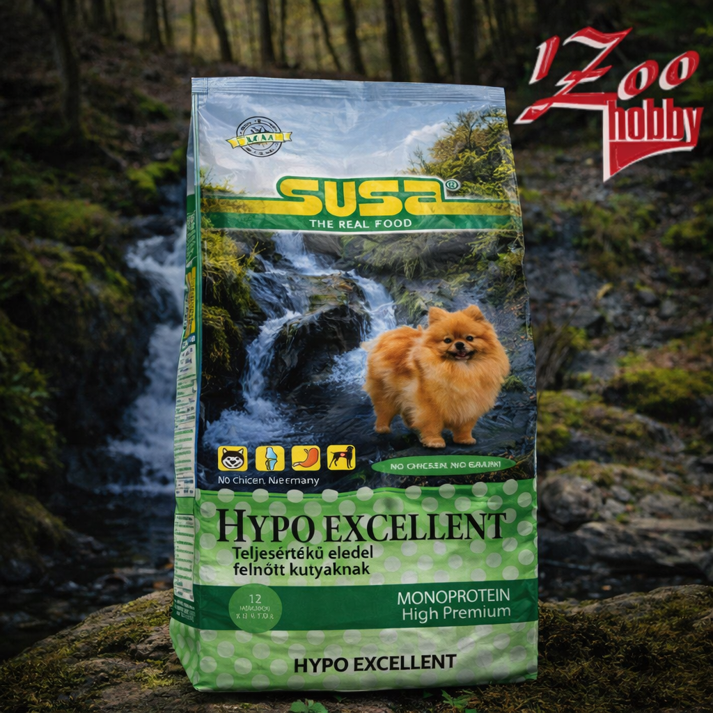 SUSA Hypo Excellent este o hrană completă super premium fără cereale și fără carne de pasăre, formulată cu rață și cartofi pentru câinii adulți de toate taliile cu alergii alimentare sau sensibilitate digestivă. Cartoful (44%) și proteina de rață (28%) sunt singurele surse de carbohidrați și respectiv proteine animale, eliminând cele mai frecvente alergene. Semințele de in și uleiul de pește asigură un raport optim de acizi grași omega 3:6, susținând sănătatea pielii și a blănii. Cicoarea uscată acționează ca prebiotic natural, iar mărul adaugă fibre ușor digerabile pentru un tract digestiv echilibrat.